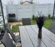Curtea este amenajata cu gazon si plante decorative, gratar, set masa + scaune pentru 8 persoane, masina de tuns iarba.