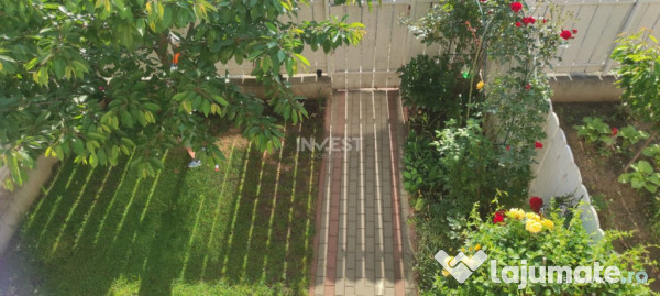 Grădină în fața casei amenajată cu flori, gazon și un cireș Grădină în spate cu zonă de relaxare, grătar, gazon și o mică grădină de legume – locul perfect pentru petrecerea timpului în aer liber .