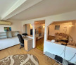 • bucătărie deschisă, complet mobilată și utilată (aragaz + cuptor, frigider + congelator, hotă și cuptor cu microunde),