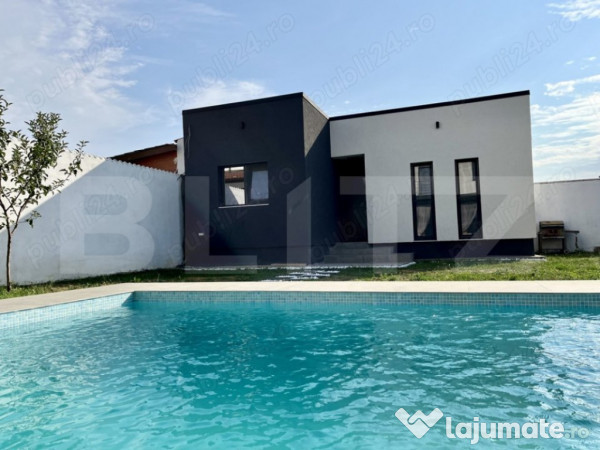 La parter avem un living cu înălţimea de 7m si balcon interior, view panoramic catre curte si piscina, bucătărie open space cu acces direct in terasa, hol, baie, cameră tehnică şi un dormitor. La etaj avem doua dormitoare, dintre care unul cu dressing propriu, baie, hol şi camera destinata hainelor (laundry room). Fiecare dintre dormitoare este prevăzut cu balcon propriu. Dormitoarele sunt prevăzute cu mochetă de calitate superioară, parchet laminat şi gresie si faianţă de import.
