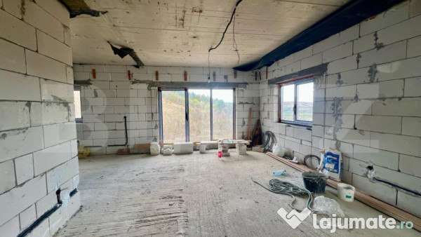 Casa este parțial finalizată, în stadiul „la roșu”, ceea ce permite viitorului proprietar să personalizeze finisajele interioare după propriul gust. Accesul se face pe drum pietruit, iar rețelele de utilități (apă, electricitate, canalizare) sunt disponibile în zonă.