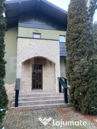 La exterior avem o terasa generoasa acoperita, un foisor superb cu plita, gratar, chiuveta. Curtea este amenajata cu iluminat, gard de tuia. Accesul in curte se face pe poarta care se deschide cu telecomanda. Casa se desfasoara pe 322 mp, utili 268 mp, pe un teren de aproximativ 750 mp.