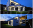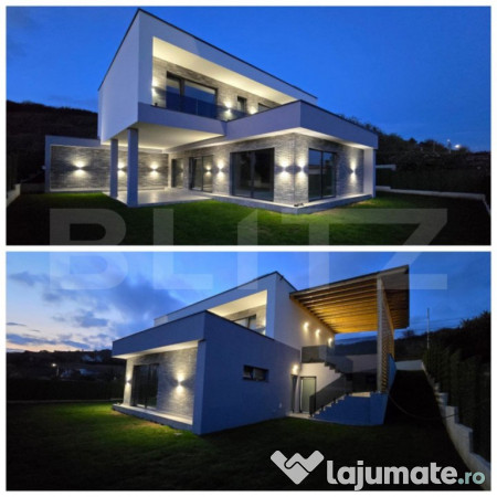 Casa dispune de dotări premium: încălzire în pardoseală, pompă de căldură Ferroli, panouri fotovoltaice cu garanție 10 ani, geamuri Salamander și o curte amenajată cu gazon și pavaj Elis. Garajul acoperit include o priză pentru mașină electrică, iar poarta automată și videointerfonul adaugă un plus de confort și siguranță.