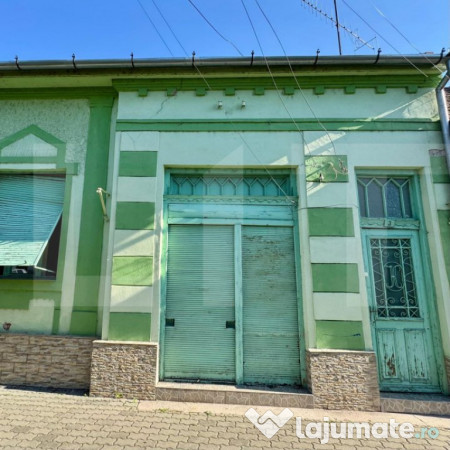 Direct pe strada principală din Pâncota, atrage atenția o clădire vopsită într-o culoare verde prietenoasă. O zonă comercială pe partea stângă și o ușă frumoasă pe partea dreaptă.