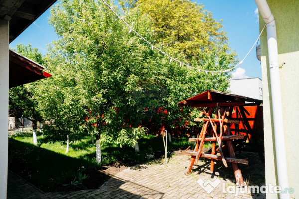 Proprietatea dispune de un teren generos de 732 mp, frumos amenajat, care include un garaj, un foișor și o zonă de relaxare, creând un ambient plăcut și primitor.