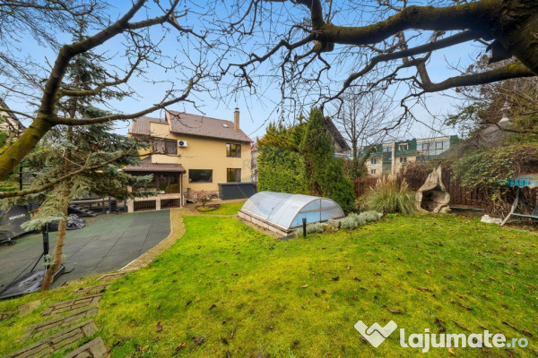 Grădina intima, este amenajata cu plante ornamentale, terasa acoperita, foișor barbecue si bar, bucătarie de vara complet echipată, jacuzzi si piscina exterioară încălzită.