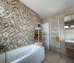 • Living spațios, elegant mobilat, cu accente rustice și contemporane