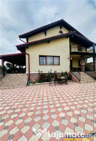 Imobilul in suprafata de 264 mp utili si este amplasat pe un teren de 2389 mp, cu o curte frumos amenajata, cu o peisagistica aparte ce se remarca prin flori, plante ornamentale, arbusti, gazon rulat, iar imprejmuirea este din beton armate.