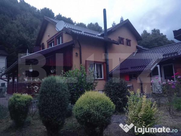 Proprietatea este ideală atât ca locuință permanentă, cât și ca reședință de vacanță sau investiție turistică (pensiune, cabană). Are o amprentă la sol de 125 m² și un teren de 745 m², cu anexe utile: garaj, atelier, magazie de lemne, saună și ciubăr. Compartimentarea este eficientă: 5 dormitoare, 3 băi, living cu șemineu, bucătărie, cămară și terasă acoperită.
