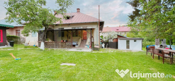 La intrarea in imobil suntem intampinati de o terasa spatioasa, acoperita, pe structura de lemn si imprejmuita cu un gard de lemn.