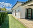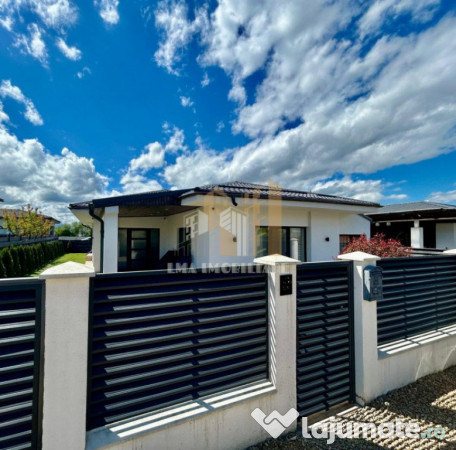 Odata ce am intrat in curtea proprietatii regasim tot spatiul amenajat cu gazon,alee (pavata cu travertin de exterior),zone de arbusti decorate cu piatra de rau si un loc de parcare,al doilea loc de parcare se poate amenaja in partea stanga a proprietatii in functie de necesitate.