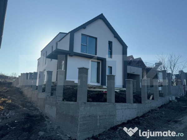 Blitz va ofera spre vanzare o casa individuala situata in zona nou dezvoltata a comunei Chinteni chiar la intrare, pe o strada cu 8 case, cu o suprafata util de 136mp, terasa 23mp, garaj 21mp si teren aferent de 700mp, cu situație juridica clara cu drumuri cedate spre primarie în lățime de 8m. Terenul dispune de utilitati cu contor la apa și curent, precum și sistem de canalizare, curand v-a fi instalat si gazul. Casa se preda la stadiul de semifinisat, exteriorul cu decorativa , geamuri termopan, interior instalatii electrice, tencuiala cu plasa si 2 maini de glet, incalzire in pardoseala, cu centrala propie pe curent de ultima generatie economica, boiler si sapa. Compartimentarea acesteia este gandita astfel: Parter: un hol generos de intrare, camera depozitare langa garaj, baie, bucatarie, dining si living spatios cu iesire pe terasa. Etaj: dormitor matrimonial cu dressing si baie proprie, 2 dormitoare si baie. Casa este construita cu materiala de calitate premium, din BCA Ytong de 25 cm, cu coeficient de transfer termic redus. Acoperișul va fi din tigla cu o expoziție sudica perfecta pentru montarea unui sistem de panouri fotovoltaice. Detine incalzire in pardoseala sus si jos, instalație apa caldă apa rece, sanitare si proiect de gradina. Termen de finalizare Septembrie 2025. Pentru mai multe detalii si vizionari, nu ezitati sa ne contactati!.