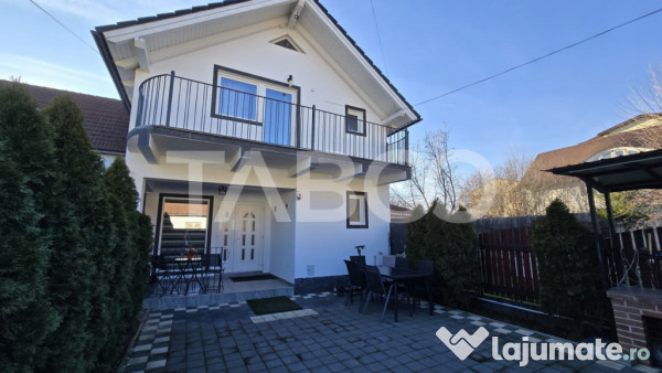 Casa are un stil modern si elegant si este de vanzare complet mobilata si utilata. Imobilul are o curte libera de 71 mp cu 1 loc de parcare, spatiu pentru zona de joaca a copiilor, terasa frumos amenajata si zona de grill.