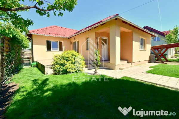 Apostu Estate va ofera spre inchiriere casa individuala parter in Dumbravita, zona linistita, 500 m distanta firma Fropin – Lidl, constructie solida 2007, spatioasa, suprafata utila 85 mp, 300 mp gradina cu gazon si amenajata ornamental.