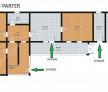 Parterul masoara 140,87 mp, acesta fiind compus din 4 camere generoase cu suprafete de 22.96 mp, 22.63 mp, 22.43 mp, 20.00 mp, hol de acces casa scarii 12.56 mp, al doilea hol de 10.28 mp, baia 6.10 mp dotata cu geam de aerisire iar ca si corpuri separate cu intrari separate, o camara de 7 mp de unde se poate face accesul in pod si bucataria de 15.91 mp