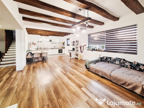 - Etajul găzduiește două dormitoare luminoase, un mic birou pentru momentele de concentrare și o terasă spectaculoasă, unde poți admira apusul în fiecare seară.
