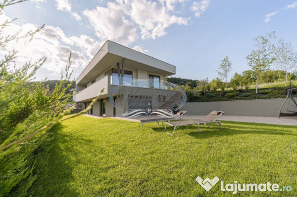 Koncept Imobiliare va ofera spre vanzare o casa individuala de exceptie, localizata intr-o zona exclusivista, retrasa de la strada principala, intr-un cadru pitoresc si aerisit al comunei Feleacu. Imobilul, avand suprafata utila de 361 mp, dispus P+E si teren in suprafata de 1.700 mp, este compartimentat astfel: la parter- living spatios open space cu bucataria si zona de dining + camara de alimente, o camera cu dressing, baie, inca un dressing si garaj pentru 2 masini; la etaj- dormitor matrimonial cu dressing si baie proprie, inca 2 dormitoare, baie, camera tehnica si pivnita. Casa se remarca prin armonia spatiilor gandite in detaliu, imbinand frumosul cu utilul intr-un mod simplu, dar placut si foarte primitor, oferind siguranta, intimitate si personalitate. Calitatea constructiei, a finisajelor, a mobilierului si a aparaturii vin doar sa intregeasca cele spuse, amintim aici: confort termic realizat cu centrala termica proprie (pe gaz)+ termosemineu si incalzire prin pardoseala, aspirator central, sistem de irigatie automatizat pentru gazon, zona pentru barbeque cu grup social, supraveghere video etc. Potrivita pentru cineva care isi doreste o casa cu adevarat exceptionala cu o panorama de vis, aer curat si foarte intima, la doar cateva minute de Cluj-Napoca. Pentru informatii complete, pentru programarea unei vizionari sau pentru a afla oferta noastra completa nu ezitati sa ne contactati telefonic, prin email sau la sediul agentiei noastre pe strada Aviator Badescu nr. 19, Cluj-Napoca