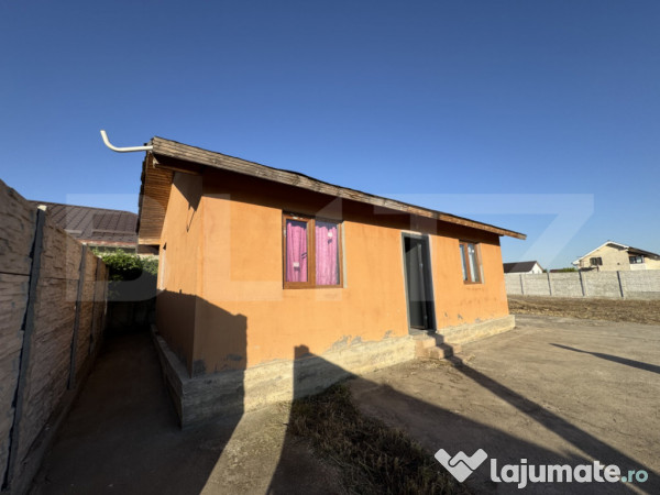 Casa a fost ridicata in 2018 si are urmatoarea compartimentare: living cu bucatarie open space, 1 dormitoar si 1 baie, pod, iar ca sursa de incalzite are o centrala pe peleti, situata in living, cu calorifere de aluminiu.