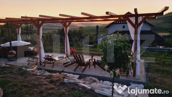 Proprietatea dispune de un ciubar din fibra de sticla pt 8 persoane, prevazut cu functii de hidromasaj și iluminat ambiental.