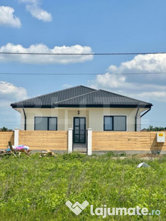 -un living generos, 3 dormitoare, bucatarie si grup sanitar. In partea din spate a casei este amenajata o terasa acoperita cu iesire din bucatarie.