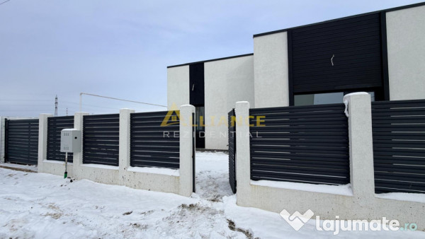 Casa este compusa din 3 camere, bucatarie si doua bai echipate complet, una cu acces din camera matrimoniala, si dispune de incalzire prin pardoseala, tamplarie geamuri - tripan , placa de beton.