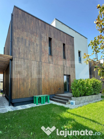 Casa dispune de 2 locuri de parcare exterioare cu stație de încărcare mașini electrice, curte amenajată ultramodern cu gazon și plante de grădina, automatizare smart pentru irigații și roboti pentru tunderea gazonului, terasa spate amenajată și jardiniere cu sistem de irigare smart individual.