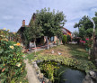 Curte amenajată cu beton amprentat, gazon verde și iaz cu pești – un colț de relaxare unic