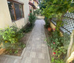 Curte amenajată cu gazon, pomi fructiferi, pavaj, gard de beton și acces auto