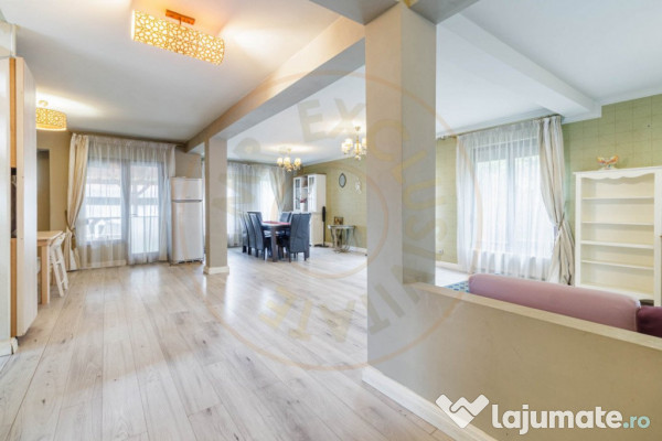 La parter, te întâmpină un living impresionant, generos și luminos, perfect pentru seri liniștite în familie sau pentru întâlniri cu prietenii. Bucătăria este open space, complet mobilată și utilată, integrată natural în spațiul de zi. Tot aici găsești o baie de serviciu și un birou amenajat în locul fostului garaj – un spațiu ideal pentru lucrul de acasă, studiu sau hobby-uri.