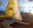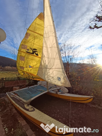 Vand Catamaran cu vele Hobie Cat 14. Folosit, prezinta urme de utilizare. Material, GRP, nu pneumatic. Lungime 4,3 metri, catarg 7 metri, masa 80 kg. La aceeasi viteza a vantului, are o viteza incomparabil mai mare fata de o monococa. Poate fi condus fara CAA. Are 2 vele, randa si foc (fragmentat). Functional, complet si gata de pus pe apa. Velele si trampolina au fost asezate formal, pentru exemplificare.
