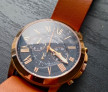 Fossil FS4835, curea maro deschis, cadran albastru inchis, carcasa aurie.
