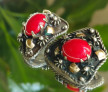 În centru, câte un coral roșu natural, opac la lumină UV, cu nuanță intensă și luciu cald, montat în gheare florale