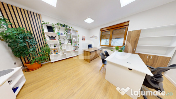 Caracteristici: Regim inaltime: D+P+E+M. Suprafata totala desfasurata: 280 mp, destinație schimbata - functioneaza ca spatiu de birouri, baie pe fiecare nivel al cladirii (la parter sunt 2 bai), sistem de aer conditionat in fiecare incapere, complet mobilat (au fost create numeroase spatii de depozitare, dulapuri, etajere), bucatarie complet mobilata si utilata, loc de luat masa.