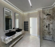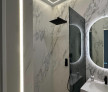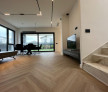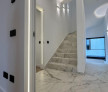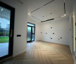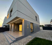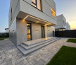 Ferestrele ample din PVC antracit marca Veka cu geam tripan asigură eficiență energetică sporită și un aport generos de lumină naturală. Terasele exterioare sunt placate cu materiale ceramice antiderapante, iar iluminatul LED exterior și ambiental completează aspectul contemporan al vilei.