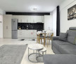 - Bucataria, care este de tip open space, cu mobilier integral;