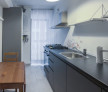 Bucătărie modernă cu mobilier gri mat premium, aragaz cu gaz, hotă, frigider, combină frigorifică
