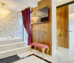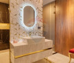 Dormitoarele transmit liniște și intimitate. Materialele moi, lumina caldă, scenografia atent compusă și senzația de spațiu creează un refugiu ideal pentru odihnă autentică. Baia principală, cu trepte de marmură, duș walk-in și cadă sculpturală, respiră aerul unui spa privat, unde timpul încetinește.