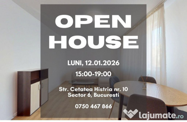 OPEN HOUSE – Vă invităm pe data de 12.01.2026, între orele 15:00–19:00, la un eveniment de tip „porți deschise”, unde puteți vizualiza apartamentul.