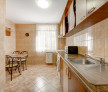 Bucataria este mobilata si dotata cu aragaz, hota, frigider, masina de spalat rufe si cuptor cu microunde. Tot in bucatarie este si locul de luat masa pentru 4 persoane. Bucataria este extrem de spatioasa.