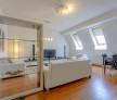 Compartimentarea interioară este compusă dintr-o zonă de zi cu bucătărie deschisă, două dormitoare, două băi și un hol. Locuința se închiriază complet mobilată și utilată.