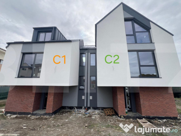 • La exterior: complet finisat – fațadă finalizată, sistem de irigare automat conectat la bazin de colectare a apelor pluviale, alei pavate, spații verzi amenajate, gard complet și zonă de garare amenajată