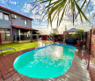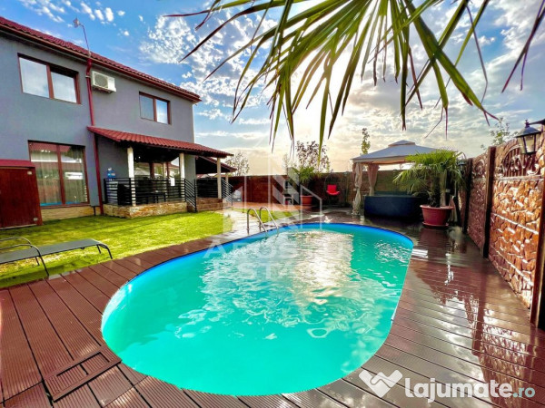 Curtea este complet amenajata, beneficiind de gazon, palmieri, sistem de irigare automatizat, piscina si acces auto in curte (port car).