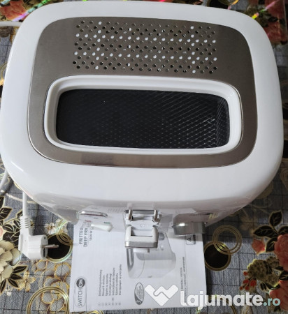 Capacitate 2 ,2 L.Termostat reglabil până la 190°C,pentru diferite tipuri de alimente și capac prevăzut cu filtru de aluminiu pentru mirosuri, și fereastră de vizualizare