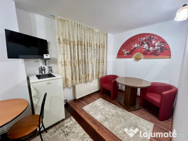 Garsoniera este complet mobilată și utilată, cu electrocasnice de calitate superioară, oferind tot confortul necesar. Bucătăria este dotată cu toate cele necesare: plită, cuptor, hotă, frigider, mașină de spălat rufe. Mobilierul modern și designul interior rafinat creează un ambient plăcut și elegant. Beneficiaza de aer conditionat care iti permite sa pastrezi sau sa controlezi temperatura optima indiferent de anotimp si centrala proprie. Această garsonieră reprezintă alegerea ideală pentru cei care caută un spațiu intim, modern și elegant.