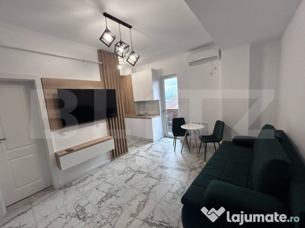 Blitz va propune spre inchiriere o garsonieră modernă, cu o suprafata de 38 mp, mobilată complet, la etajul 25al unui bloc nou situat in cartierul Rovine. Amenajată cu mobilier pe comandă, oferă un design modern și funcțional, aceasta este dotata cu frigider, aragaz si cuptor electric, tv smart si masina de spalat rufe. Locuința este complet mobilată și utilată, exact ca în poze si se afla la prima inchiriere. Beneficiaza de incălzire prin pardoseală, asigurată de centrală termică pe gaz si aer condiționat pentru confort sporit. Pentru mai multe detalii, va asteptam cu drag la vizionare!