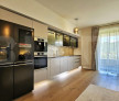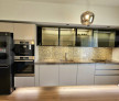 Bucătărie modernă cu electrocasnice Bosch noi și neutilizate: frigider side by side, cuptor, plită cu hotă integrată, mașină de spălat vase, mașină de cafea încorporată