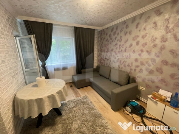 Apartamentul este in stadiu de renovare, cu instalatii electrice si sanitare noi si se preda la stadiul de finisat, partial mobilat, cu geamuri termopan, tamplarie PVC, parchet laminat, centrala termica pe gaz si are incluse toate utilitatile (curent electric, gaz, apa curenta, canalizare).