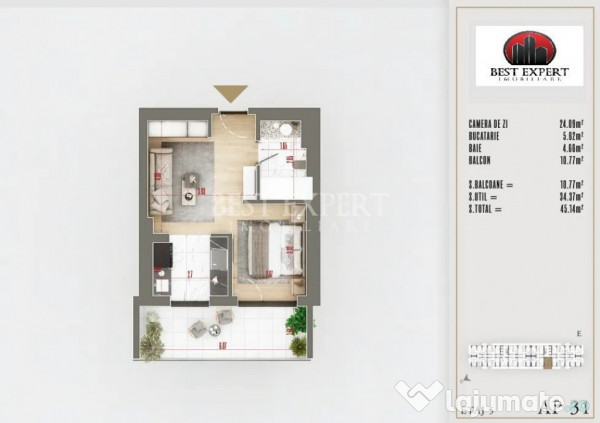 Suprafata utila – 34.37 mp utili +10.77 mp balcon, total 45.14 mp utili