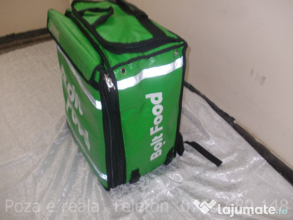 Geanta marca Bolt Food pentru livratori rideri distribuitori curieri livrari delivery curierat distribuire, depozitarea și transportul produselor alimentare si bauturilor.