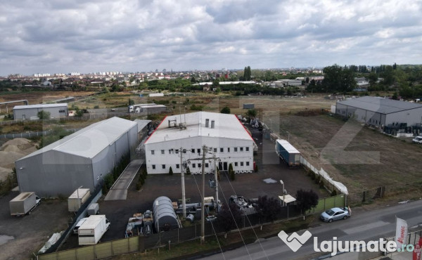 Hala industriala, cu o suprafata de 1.070 mp, construita din panouri sandwich,in partea din fata dotata cu birouri tip A foarte frumoase ,situate pe doua niveluri, parter si mezanin partial, complet si modern amenajate, mobilate functional si utilate.